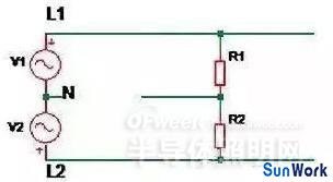 如上圖所示,V1 表示第一相電壓,V2表示第二相電壓,R1 及 R2 分別表示正常安裝到線路中的 LED 驅(qū)動(dòng)器。當(dāng)線路上零線(N)如圖斷開時(shí),兩個(gè)支路上的驅(qū)動(dòng)器 R1,R2 相當(dāng)于串聯(lián)后接到 380Vac 電壓上。因?yàn)檩斎雰?nèi)阻差異,當(dāng)其中一個(gè)驅(qū)動(dòng)器充電到啟動(dòng)時(shí),內(nèi)阻變小,電壓可能大部分加到另外一個(gè)驅(qū)動(dòng)器上,導(dǎo)致其過(guò)壓損壞失效。