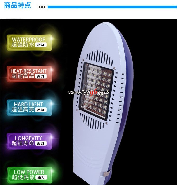 五、采用獨特的設(shè)計方案,通過透鏡二次配光,可配矩形、蝙蝠形、截光形、非截光形光斑。將LED發(fā)的光更合理利用、提高馬路照度和光照范圍。