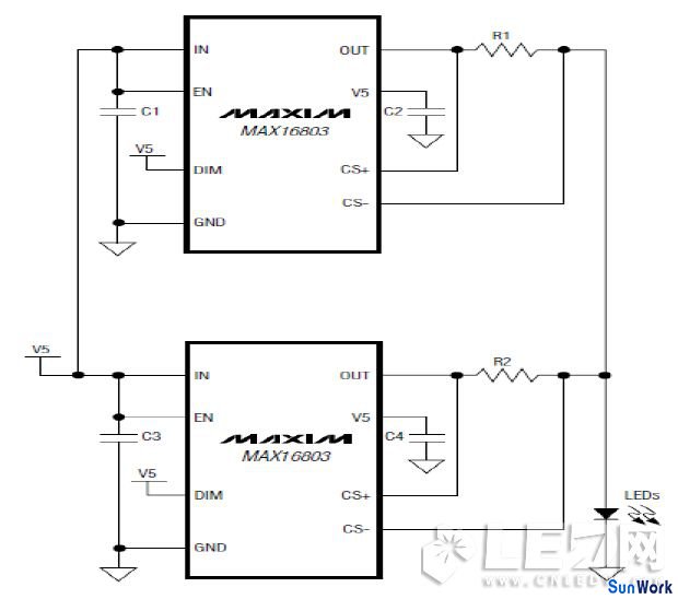 像這種檢測(cè)在LED的一端LED恒流驅(qū)動(dòng)IC也可以并聯(lián)設(shè)計(jì)驅(qū)動(dòng),實(shí)際上IC是單獨(dú)工作的,最后在并流一起。DC-DC方式是工作在較高的頻率上,需要注意的是PCB布板時(shí)避免交叉設(shè)計(jì),各自濾波、旁路電容要緊靠IC附近,負(fù)載電流最后會(huì)和即可。