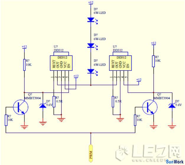 下圖采用DD312并聯(lián)參考設(shè)計(jì)直接驅(qū)動(dòng)3顆6W LED。使能PWM控制信號(hào)需要適當(dāng)?shù)母綦x,避免相互干擾和驅(qū)動(dòng)能力問(wèn)題。EN使能電壓要符合規(guī)格書(shū)要求,不要電壓太高損壞EN腳。一般IC耐壓是指負(fù)載和電源,沒(méi)有注明激勵(lì)電壓請(qǐng)不要大于5V設(shè)計(jì)。